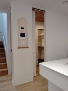 右の写真。テレビ背面の壁が天井まで無く途中までになっています。これは、あえて廊下とリビングを繋げるためだそうです。