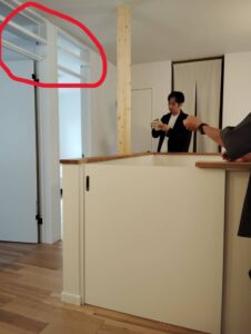 左の写真は欄間です。ドアを閉めていても、ドア上の小さなガラリを回転して空気の流れを止めないようにする。