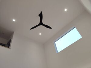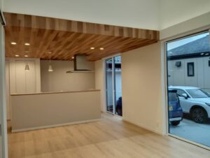 全体をホワイトの壁紙で整えた内装に木目の天井や間接照明が映えますね🤗