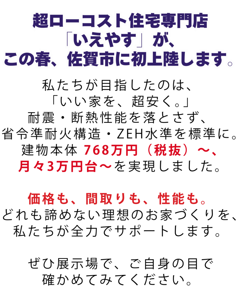 | 備 考 | \2026年3/20.21.22 OPEN!月々3万円台〜/ 「予算も間取りも性能も」そんな理想を叶えたい。長崎で実績多数のいえやすが佐賀初上陸! シングルマザー・若い夫婦・ローン不安も全力応援! お気軽にご相談下さい! |
