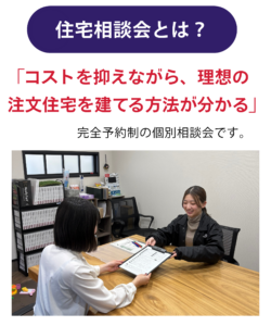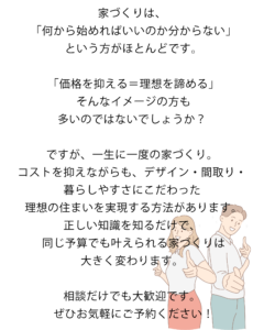 | 備 考 | コストを抑えながら理想の注文住宅を建てるための家づくり相談会。 予算・土地・間取りなど、家づくりの疑問を分かりやすくご説明します。 |