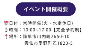 | 開催時間 | 10:00~17:00【完全予約制】 |