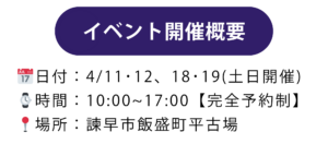| 開催日 | 4/11(土)・12(日)、4/18(土)・4/19(日) |