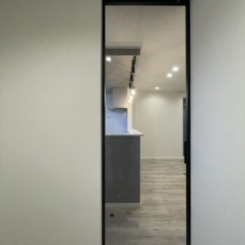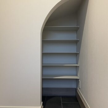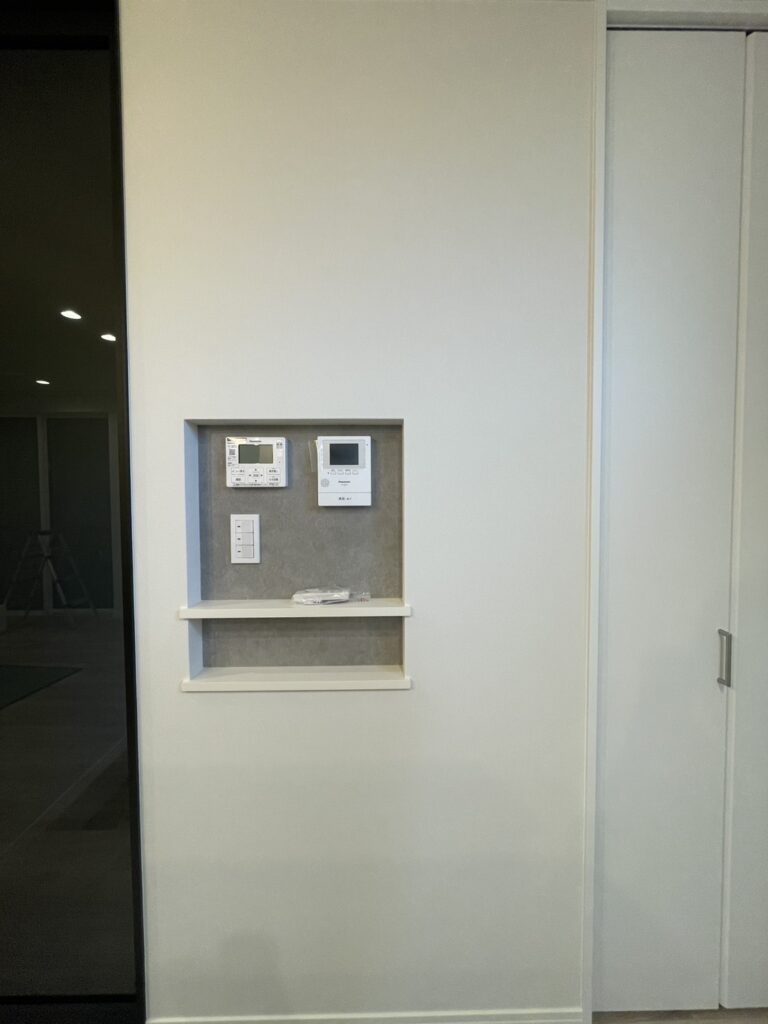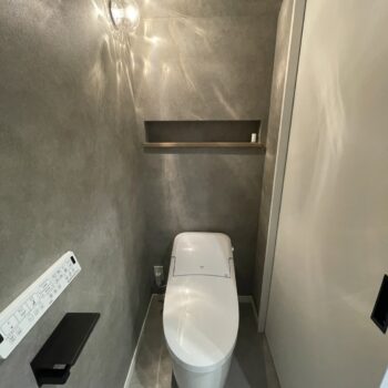 キッチン上部のグレーの下がり天井と黒のライティングレールが、都会的なセンスを演出。玄関横のアーチ型開口のシューズクロークや、黒縁のガラスドアなど、デザインと実用性を兼ね備えたディテールが随所に光ります。光の反射が美しい照明とグレー壁で仕上げられたトイレ空間は、上質でプライベートな雰囲気を演出。シンプルでありながら、細部まで機能性とデザイン性が調和した、長く愛せるモダンスタイルの家が完成しました。