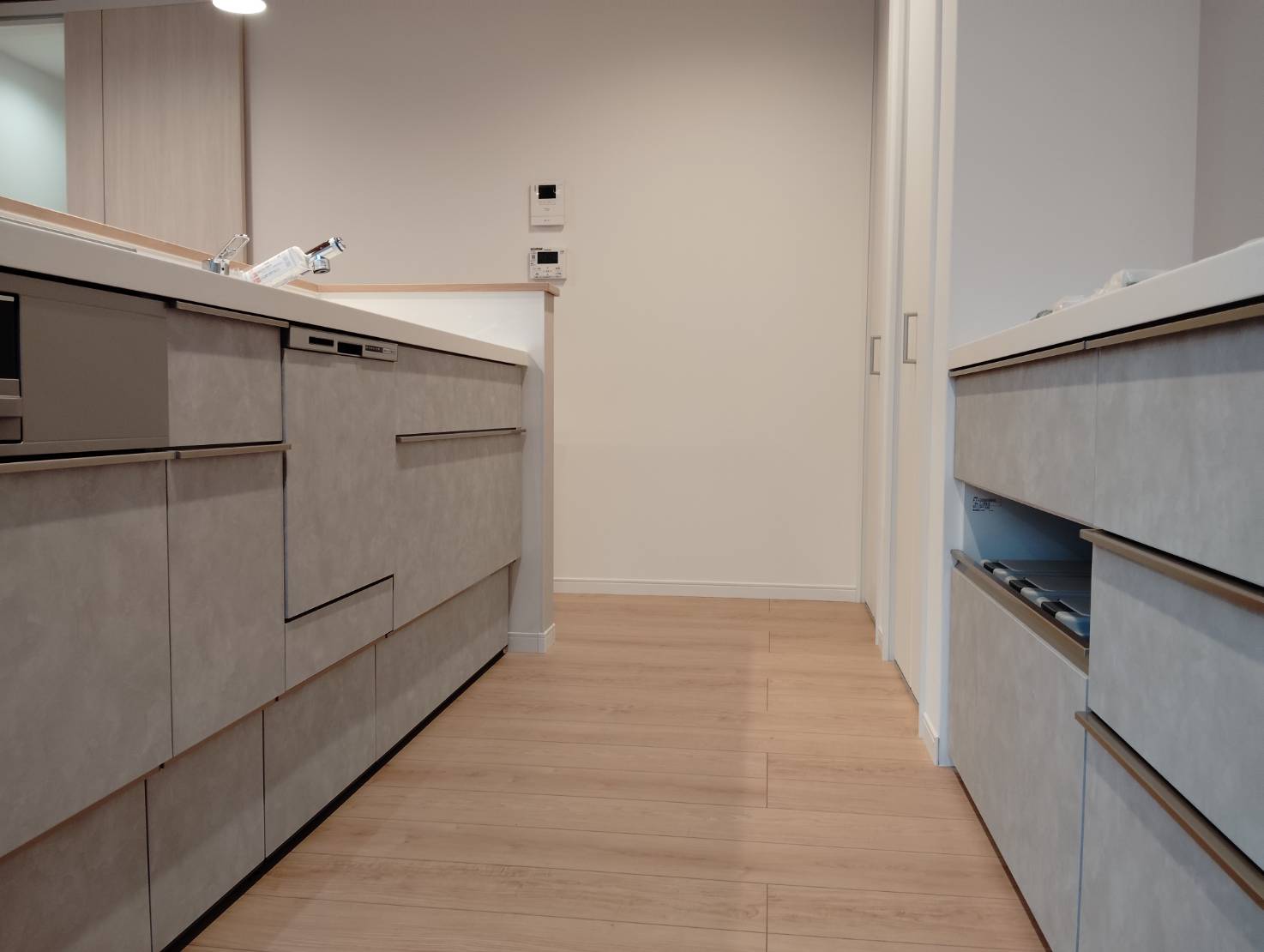 キッチン周りの薄いグレーも木目に合いますね。